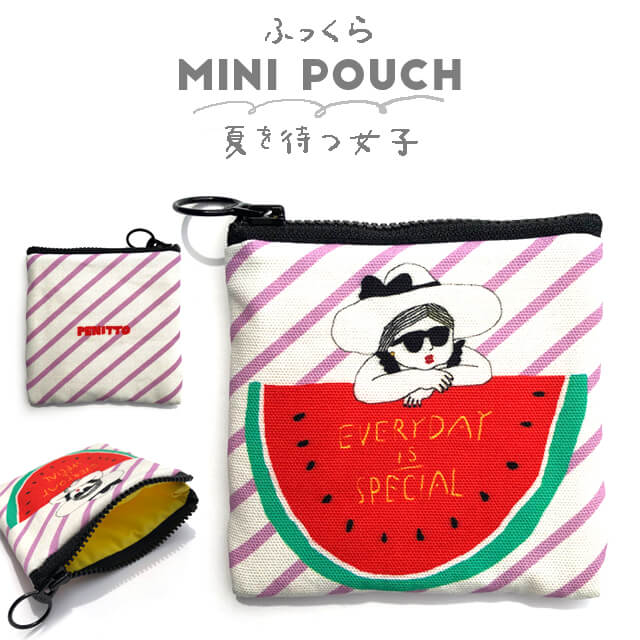 ミニポーチ 夏を待つ女子 スイカ PENITTO ポップ シュール おしゃれ 猫 個性的 おもしろ イラスト プレゼント プチギフト サニタリー フラット かわいい コンパクト ストライプ ペニット キルト芯 裏地付 小さい ハンカチサイズ ポケットサイズ 小銭入れ