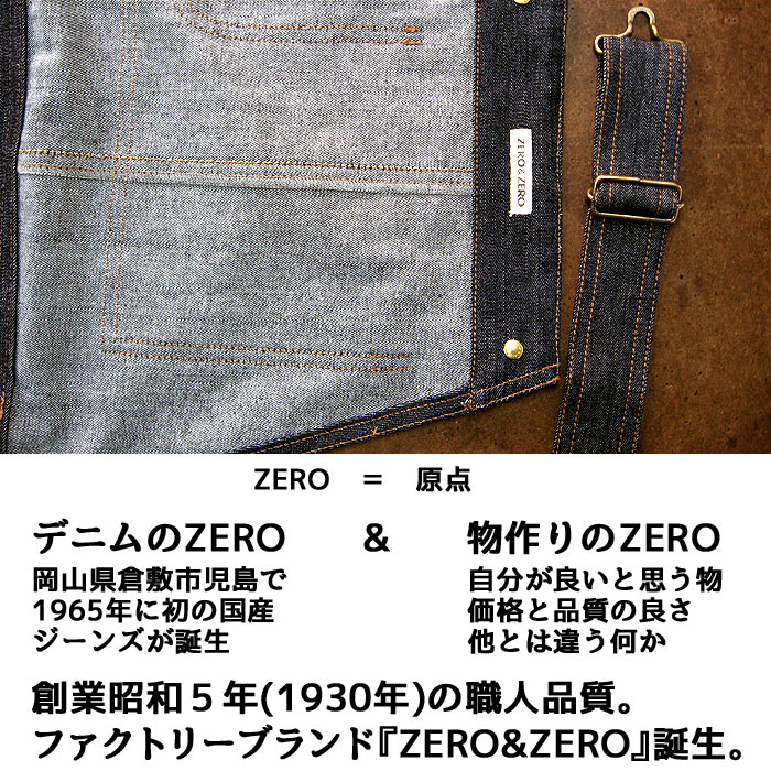 オーバーオール風 デニムエプロン ワークエプロン メンズ兼用 岡山県倉敷市児島より職人の気まぐれオリジナル商品をお届け!昭和5年創業の老舗が「使って良い物」をコンセプトにしたファクトリーブランド【ZERO&ZERO】を立ち上げました!『ジーンズ生地製品』