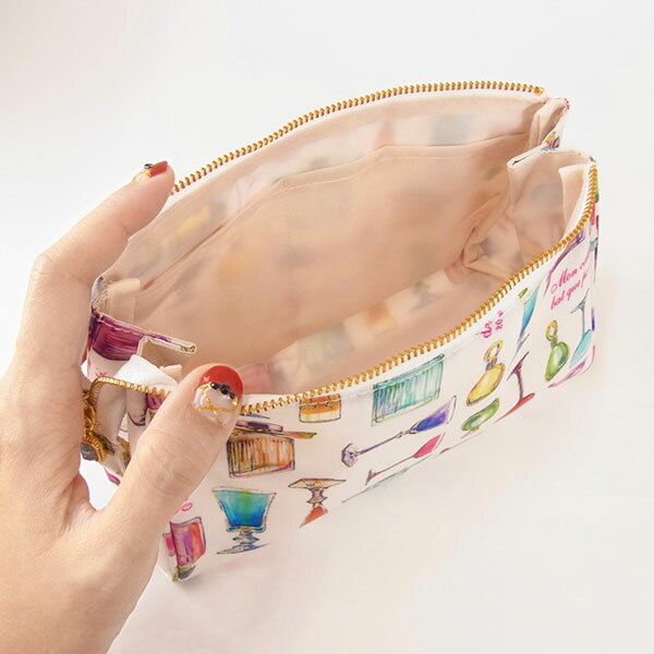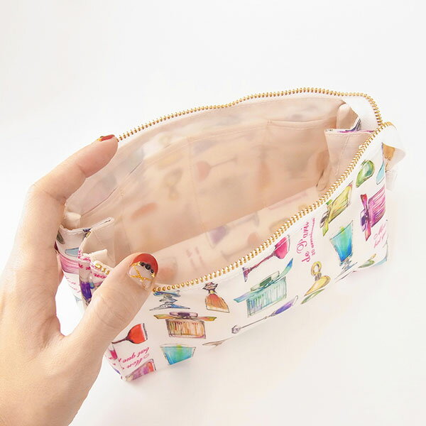 【素材】 化繊・ナイロン・綿 合金、ガラス 【サイズ】 W180×H110×D80mm 【商品説明】 ヴェニスの商人オリジナルデザインのサテンポーチが登場! 香水瓶柄のデザイン「ル・パルファン」は 当店のギフトBOXとしても人気のデザインです。